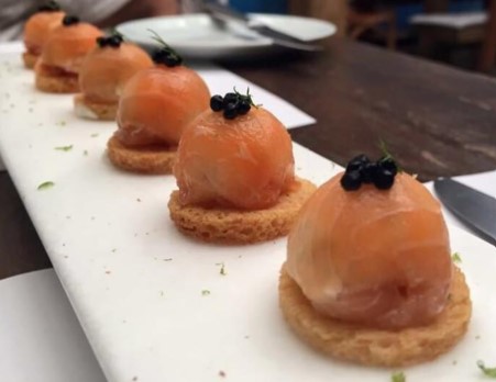 O bombom de salmão é uma entrada delicada e elegante, perfeita para impressionar seus convidados. A combinação do salmão fresco, finamente fatiado, com um recheio cremoso e suave de mascarpone, cria uma explosão de sabores e texturas na boca. Finalizado com ovas de capelin, este petisco é uma joia culinária, ideal para ocasiões especiais.