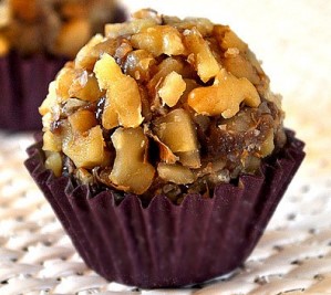 G. Com as mãos untadas de manteiga, faça bolinhas e passe-as nas nozes trituradas
