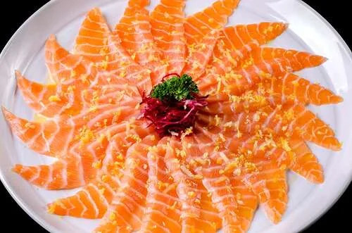Com uma faca bem afiada, corte o salmão em fatias bem finas e espalhe-as sobre um prato, cobrindo toda a superfície.