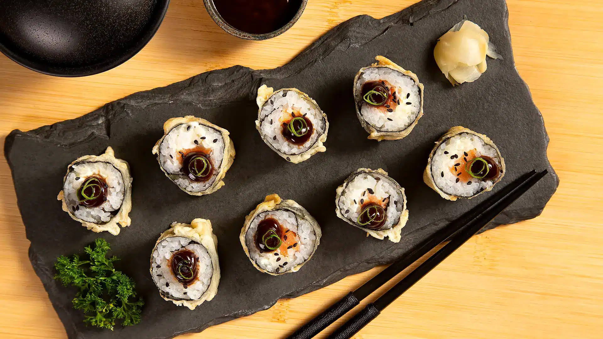 Uma versão criativa e deliciosa do hot roll, este sushi é recheado e frito, mas com uma particularidade: a folha de salmão na parte externa. O resultado é um rolo crocante, com um sabor intenso do peixe fresco e um recheio suculento, perfeito para quem busca uma experiência gastronômica única.