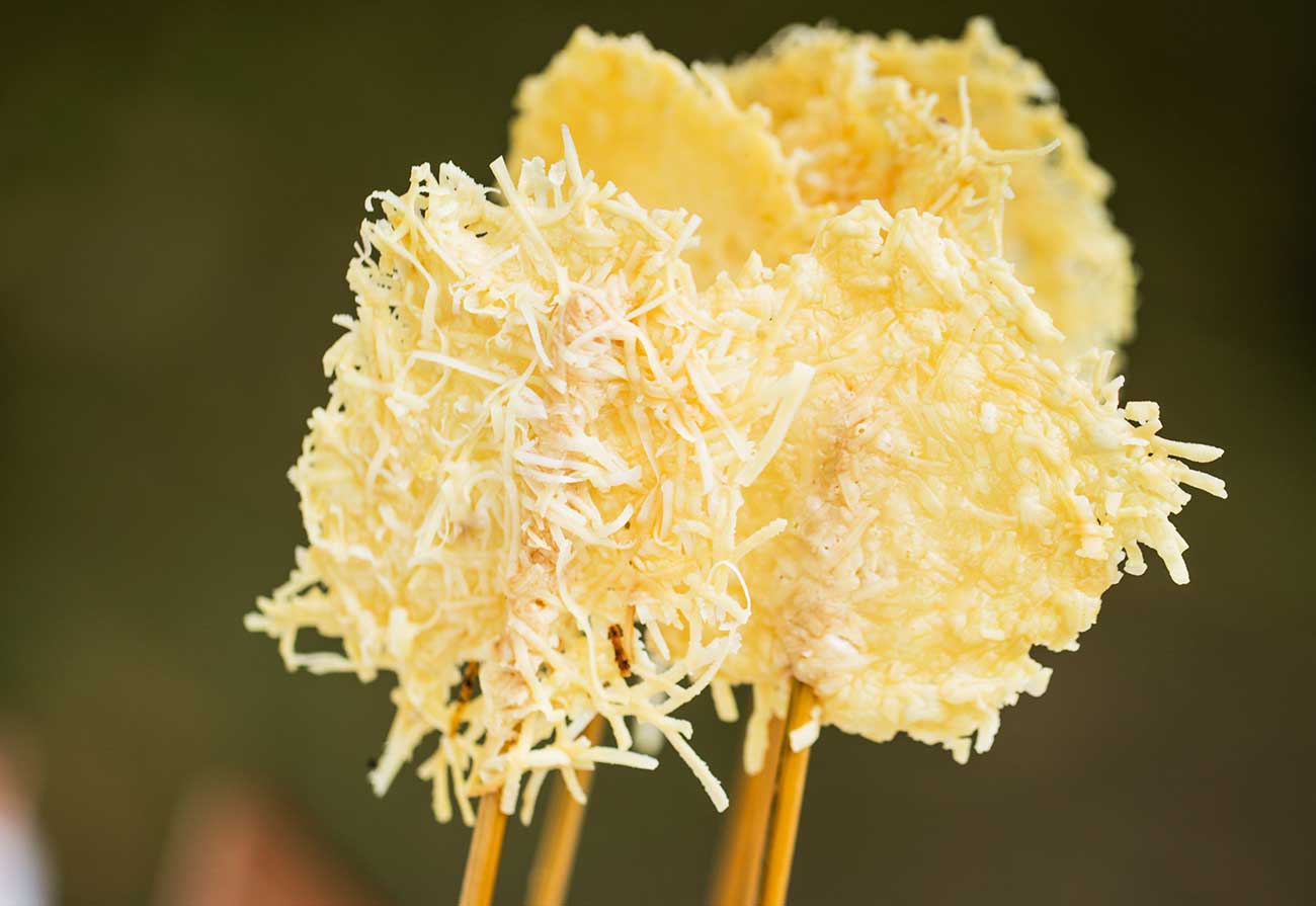 Modele: Com a ajuda de uma espátula, retire o círculo de queijo da frigideira. Coloque o queijo em uma assadeira e posicione um palito de madeira no centro, pressionando-o levemente para que grude.