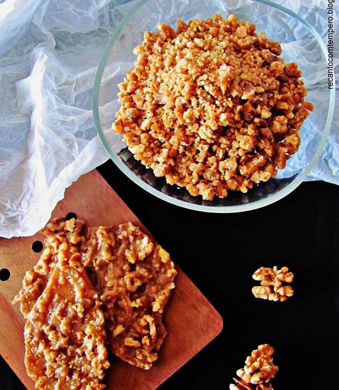 Cozimento: Em uma panela de fundo grosso, misture as nozes picadas, o açúcar e a manteiga.