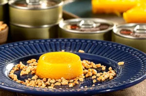 Apresentação: O quindim de amendoim fica com uma tonalidade mais terrosa, o que contrasta lindamente em uma mesa de doces com as versões de Damasco ou Chocolate.