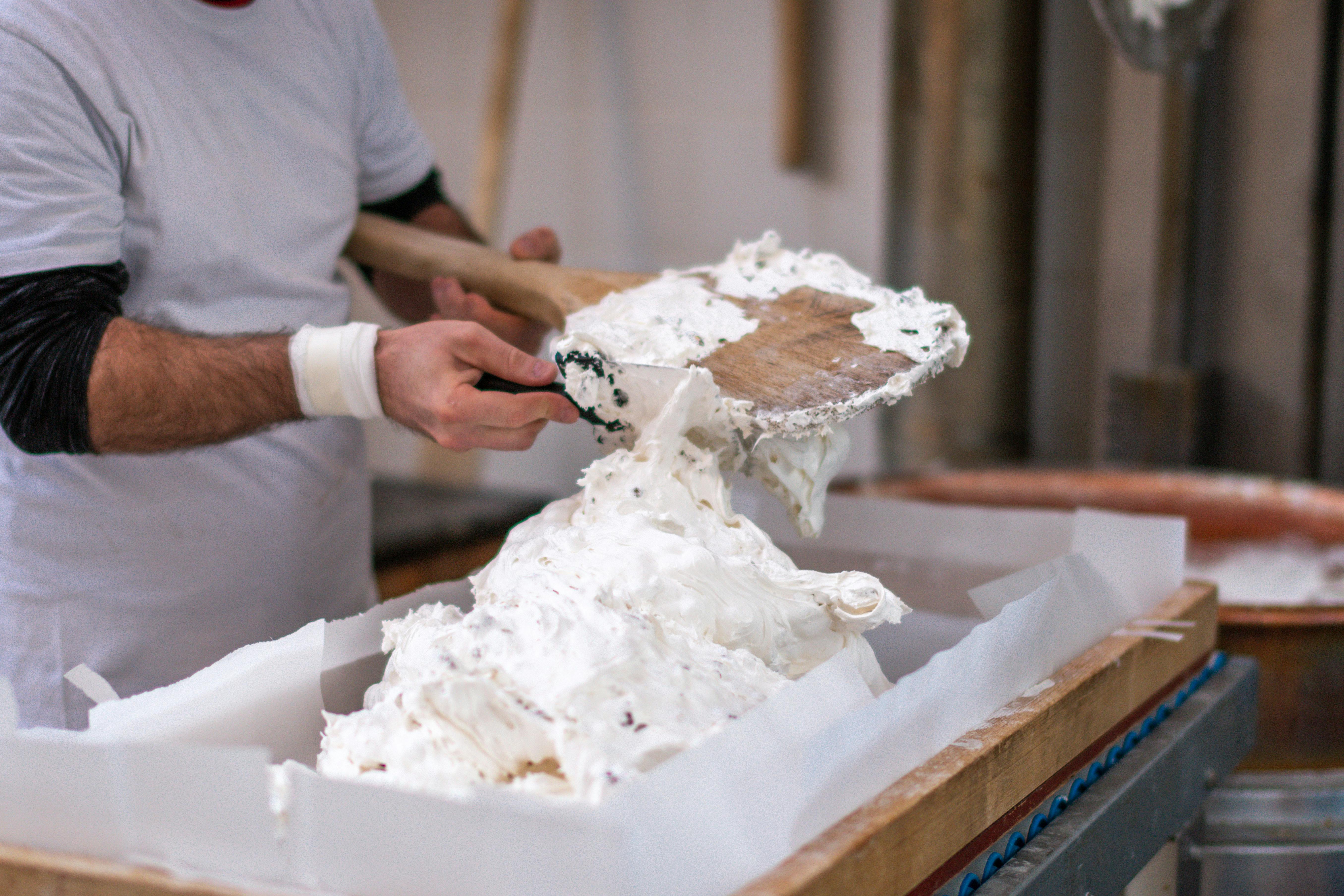 Deixe o torrone esfriar completamente em temperatura ambiente, até ficar firme ao toque. Só então desenforme, retire o excesso de amido com um pincel ou pano seco e corte em pedaços com uma faca grande e bem afiada, preferencialmente untada com um fio de óleo. Guarde em pote bem fechado.