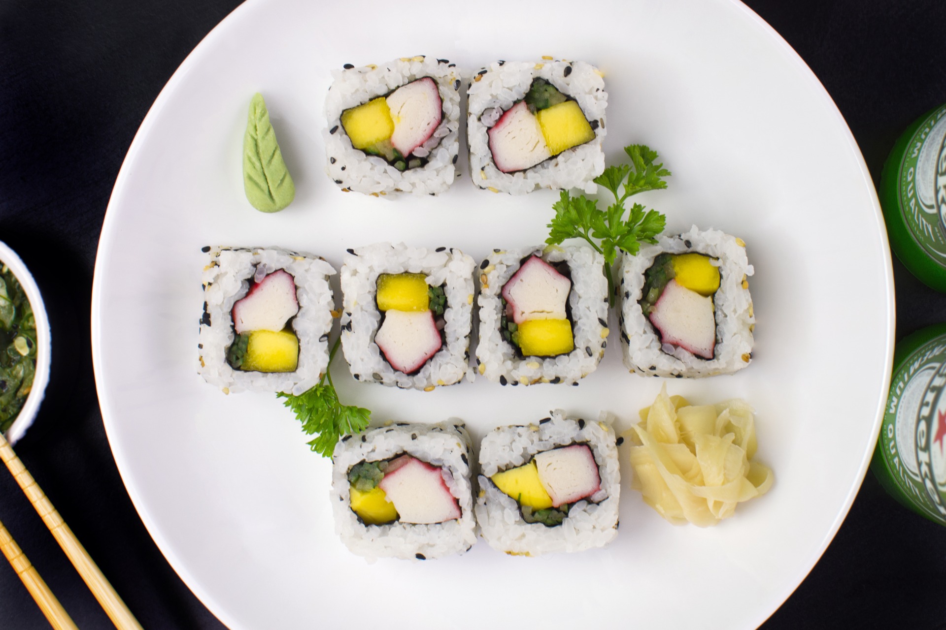 O Uramaki, ou "rolinho ao contrário", é um dos sushis mais populares, com o arroz na parte externa e a alga por dentro. Esta versão com kani-kama, manga e pepino é fresca, colorida e cheia de textura, perfeita para um almoço leve ou um jantar especial.